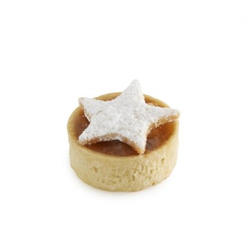 <p>Fruit mince pie comprising a shortbread case filled with fruit mince and decorated with a star shaped piece of shortbread on top</p>