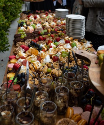 <p>a sweet tooth's delight, including mini profiterole, lemon basil cheesecakes, raspberry tonka delights, cashew frangipane, blackberry praline tart, choc cherry cake, lychee jasmine mousse, mini lemon meringue tartlets, fresh fruits,<br>